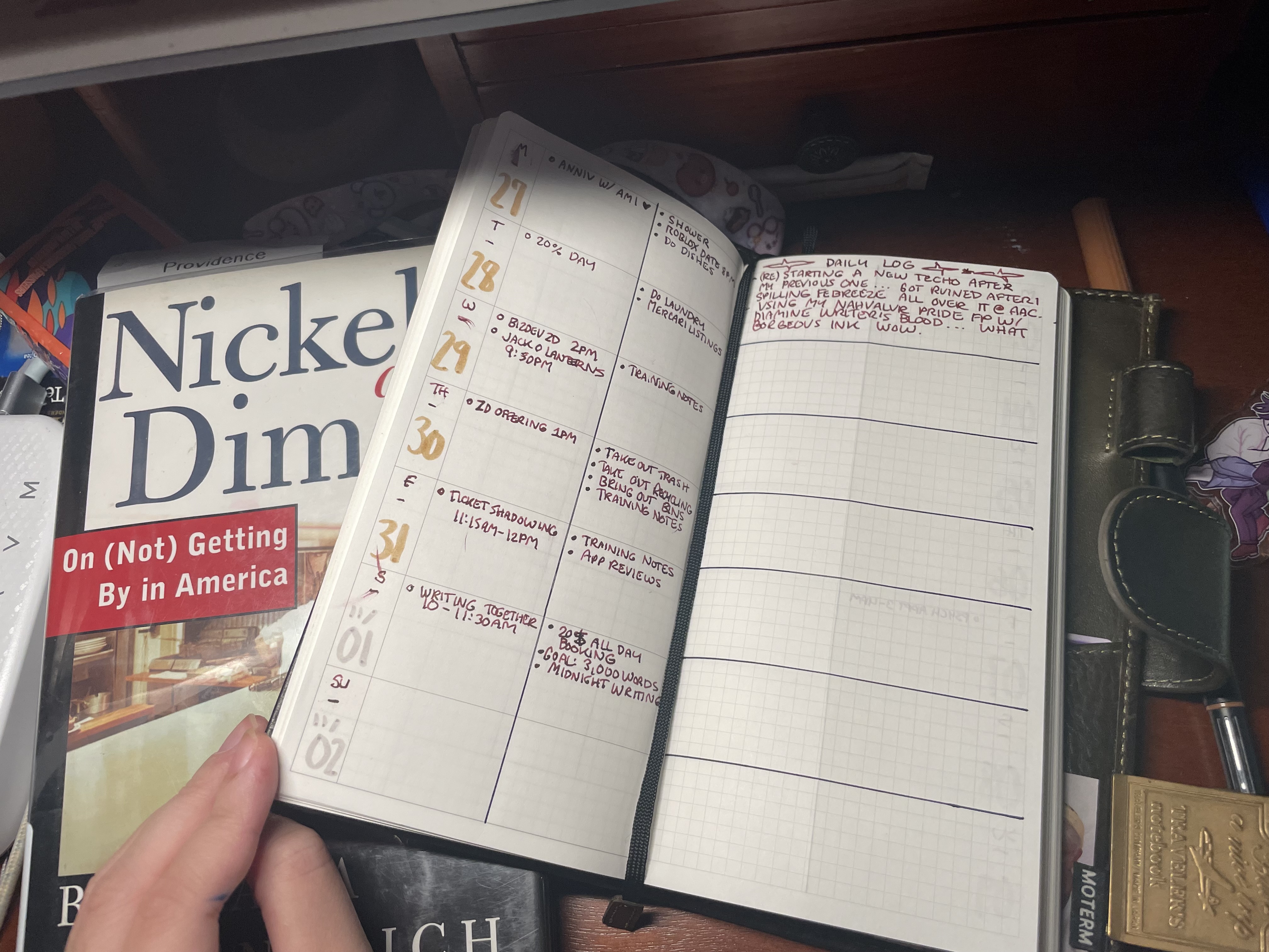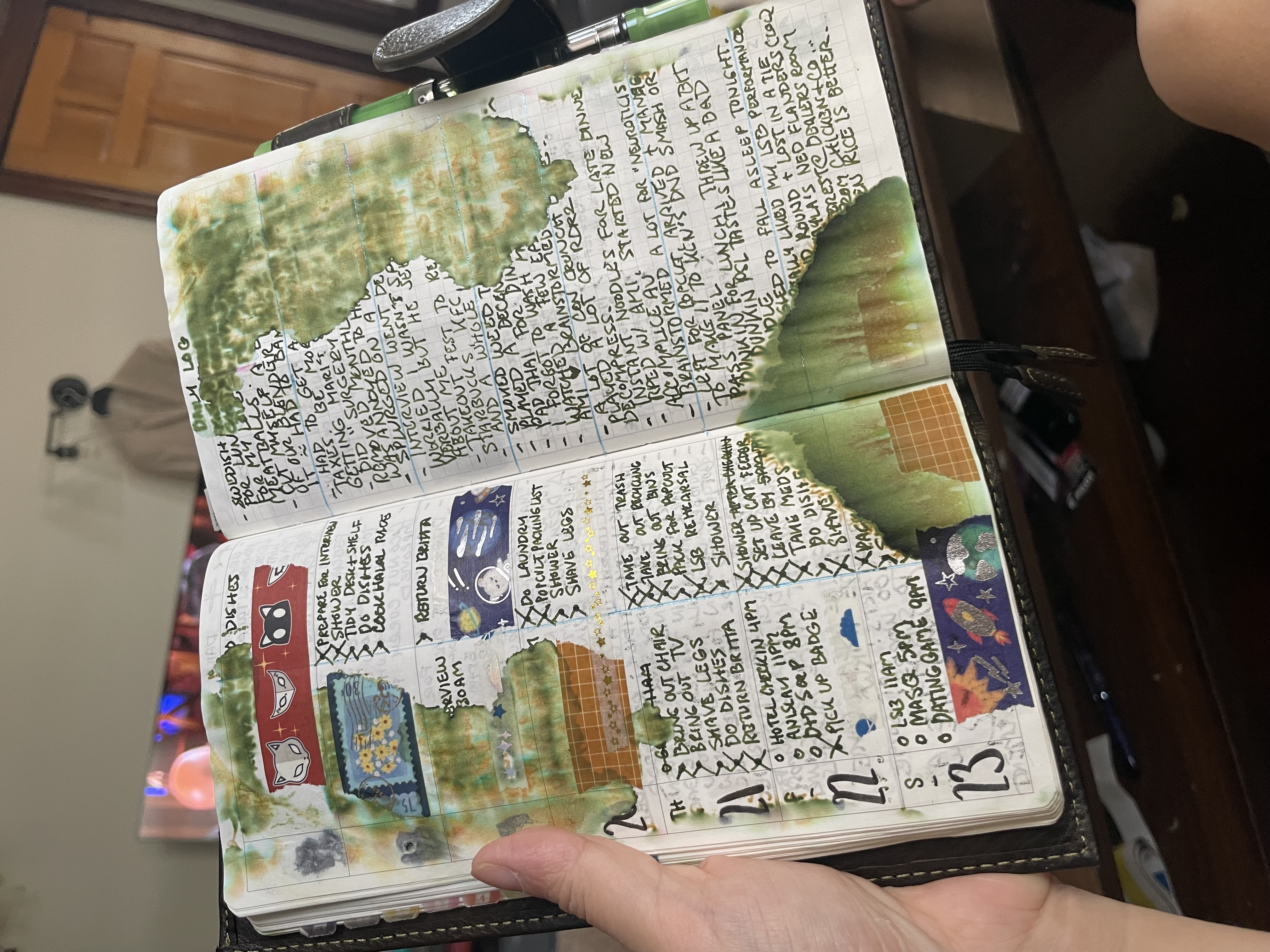 by the time i got home from the convention and evaluated the condition, i was devastated. while the worst possible result didn’t happen and the entirety of my pages weren’t ruined, there were visible water patches that ruined a decent chunk of writing. most sundays aren’t decipherable. some weeks, half of the week is blurred into a cacophony of watercolors. i was planning to transcribe every daily log i wrote down into my 5-year diary, since i gave up on writing in my 5-year diary every day. i have eight months of backlog, a good chunk of which i now have to put more effort into deciphering. i think it gave me so much anxiety that my immune system exploded and i came down with a cold. my acid reflux got bad. now i know a faint idea of what it’s like to fall ill from heartbreak.
